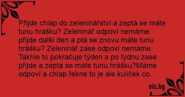Přijde chlap do zeleninářství a zeptá se máte tunu hrášku? Zeleninář odpoví nemáme přijde další den a ptá se znovu máte tunu hrášku? Zeleninář zase odpoví nemáme. Takhle to pokračuje týden a po týdnu zase přijde a zeptá se máte tunu hrášku?Máme odpoví a chlap řekne to je ale kuliček co.