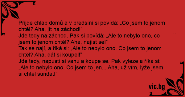 Přijde chlap domů a v předsíni si povídá: „Co jsem to jenom chtěl? Aha, jít na záchod!”