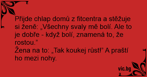 Přijde chlap domů z fitcentra a stěžuje si ženě: „Všechny svaly mě bolí. Ale to je dobře - když bolí, znamená to, že rostou.”