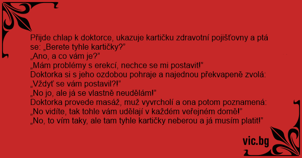 Přijde chlap k doktorce, ukazuje kartičku zdravotní pojišťovny a ptá se: „Berete tyhle kartičky?”