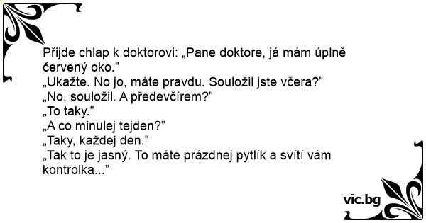Přijde chlap k doktorovi: „Pane doktore, já mám úplně červený oko.”
