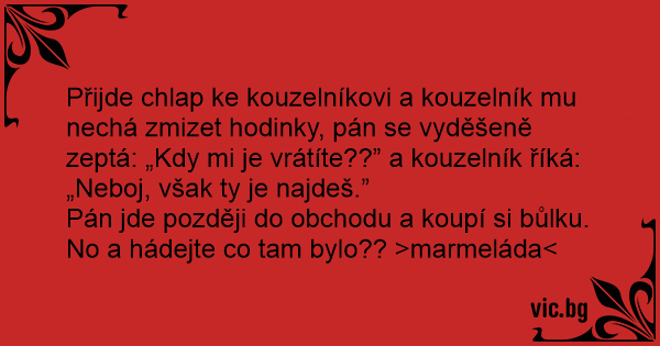 Přijde chlap ke kouzelníkovi a kouzelník mu nechá zmizet hodinky, pán se vyděšeně zeptá: „Kdy mi je vrátíte??” a kouzelník říká: „Neboj, však ty je najdeš.”