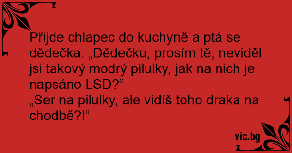 Přijde chlapec do kuchyně a ptá se dědečka: „Dědečku, prosím tě, neviděl jsi takový modrý pilulky, jak na nich je napsáno LSD?”