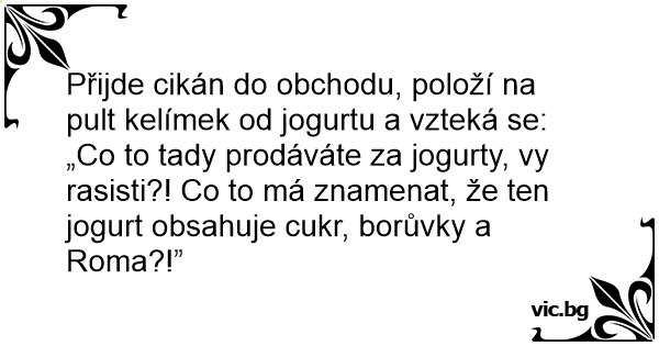 Přijde cikán do obchodu, položí na pult kelímek od jogurtu a vzteká se: „Co to tady prodáváte za jogurty, vy rasisti?! Co to má znamenat, že ten jogurt obsahuje cukr, borůvky a Roma?!”