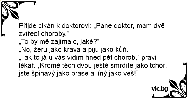 „Tak to já u vás vidím hned pět chorob,” praví lékař. „Kromě těch dvou ještě smrdíte jako tchoř, jste špinavý jako prase a líný jako veš!”