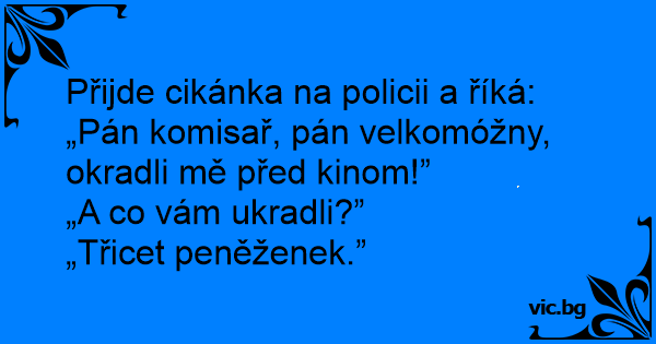 Přijde cikánka na policii a říká: „Pán komisař, pán velkomóžny, okradli mě před kinom!”