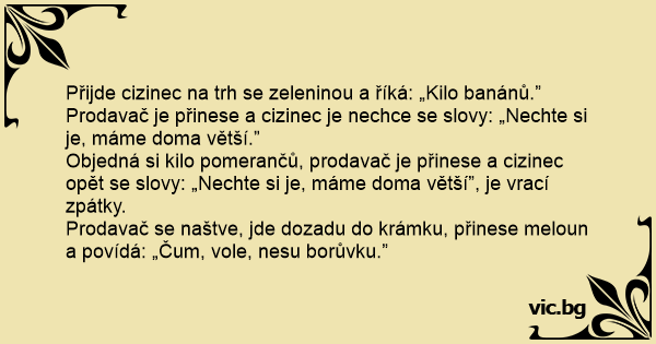 Prodavač se naštve, jde dozadu do krámku, přinese meloun a povídá: „Čum, vole, nesu borůvku.”