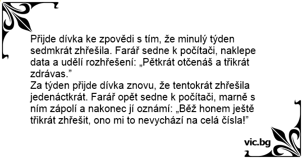 Přijde dívka ke zpovědi s tím, že minulý týden sedmkrát zhřešila. Farář sedne k počítači, naklepe data a udělí rozhřešení: „Pětkrát otčenáš a třikrát zdrávas.” Za týden přijde dívka znovu, že tentokrát zhřešila jedenáctkrát. Farář opět sedne k počítači, marně s ním zápolí a nakonec jí oznámí: „Běž honem ještě třikrát zhřešit, ono mi to nevychází na celá čísla!”