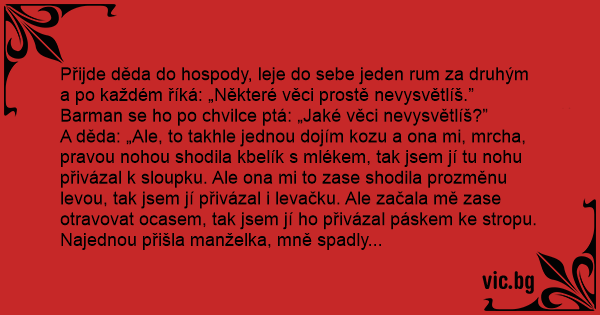 A děda: „Ale, to takhle jednou dojím kozu a ona mi, mrcha, pravou nohou shodila kbelík s mlékem, tak jsem jí tu nohu přivázal k sloupku. Ale ona mi to zase shodila prozměnu levou, tak jsem jí přivázal i levačku. Ale začala mě zase otravovat ocasem, tak jsem jí hо přivázal páskem ke stropu. Najednou přišla manželka, mně spadly kalhoty... No, některé věci prostě nevysvětlíš!”