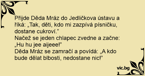 Přijde Děda Mráz do Jedličkova ústavu a říká: „Tak, děti, kdo mi zazpívá písničku, dostane cukroví.”