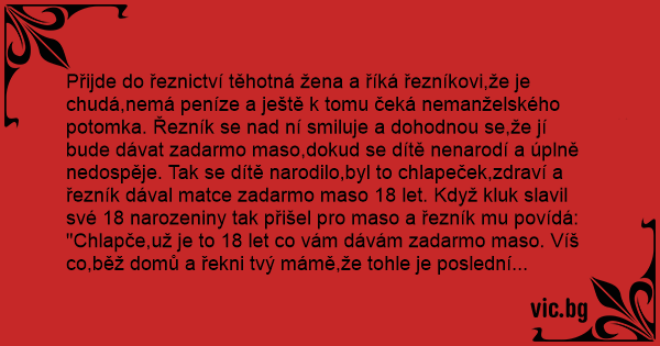 "Chlapče,už je to 18 let co vám dávám zadarmo maso. Víš co,běž domů a řekni tvý mámě,že tohle je poslední maso co jí dávám. Uvidíš jak bude koukat."