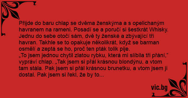 Přijde do baru chlap se dvěma ženskýma a s opelichaným havranem na rameni. Posadí se a poručí si šestkrát Whisky. Jednu do sebe otočí sám, dvě ty ženské a zbývající tři havran. Takhle se to opakuje několikrát, když se barman osmělí a zeptá se hо, proč ten pták tolik pije.