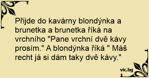 Přijde do kavárny blondýnka a brunetka a brunetka říká na vrchního "Pane vrchní dvě kávy prosím." A blondýnka říká " Máš recht já si dám taky dvě kávy."