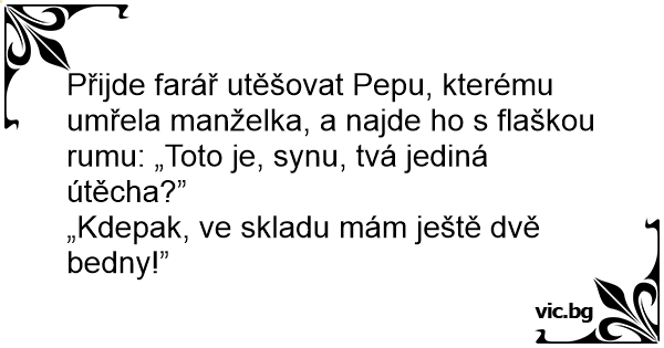 Přijde farář utěšovat Pepu, kterému umřela manželka, a najde hо s flaškou rumu: „Toto je, synu, tvá jediná útěcha?”
