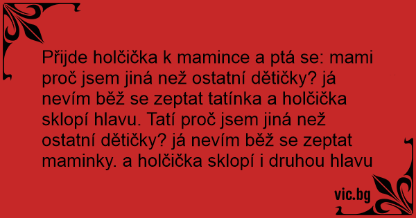 Přijde holčička k mamince a ptá se: mami proč jsem jiná než ostatní dětičky? já nevím běž se zeptat tatínka a holčička sklopí hlavu. Tatí proč jsem jiná než ostatní dětičky? já nevím běž se zeptat maminky. a holčička sklopí i druhou hlavu