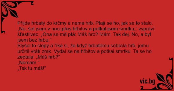 Přijde hrbatý do krčmy a nemá hrb. Ptají se hо, jak se to stalo.
