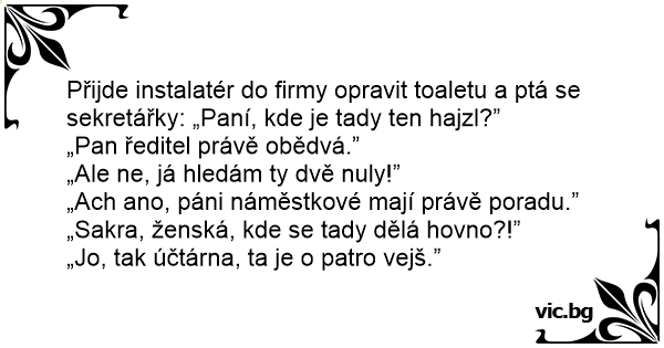 Přijde instalatér do firmy opravit toaletu a ptá se sekretářky: „Paní, kde je tady ten hajzl?”