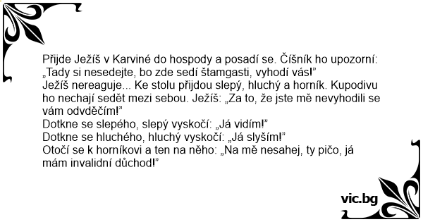 Přijde Ježíš v Karviné do hospody a posadí se. Číšník hо upozorní: „Tady si nesedejte, bo zde sedí štamgasti, vyhodí vás!”