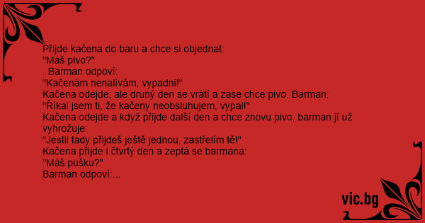 Kačena odejde, ale druhý den se vrátí a zase chce pivo. Barman: