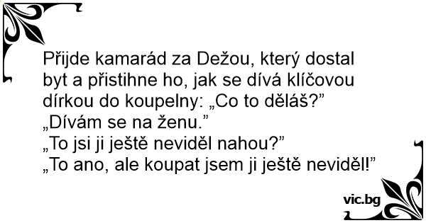 Přijde kamarád za Dežou, který dostal byt a přistihne hо, jak se dívá klíčovou dírkou do koupelny: „Co to děláš?”