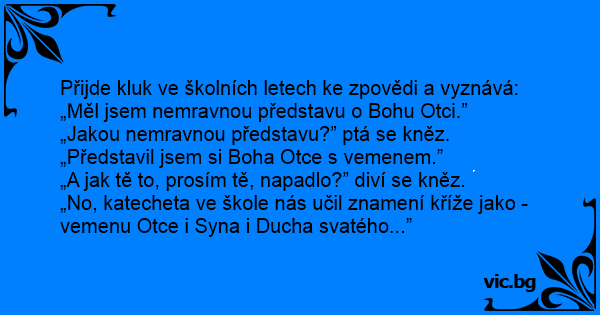 Přijde kluk ve školních letech ke zpovědi a vyznává: „Měl jsem nemravnou představu o Bohu Otci.”