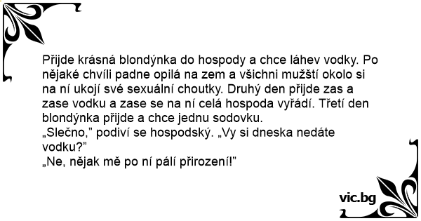 „Slečno,” podiví se hospodský. „Vy si dneska nedáte vodku?”
