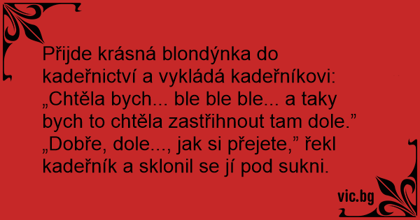 Přijde krásná blondýnka do kadeřnictví a vykládá kadeřníkovi: „Chtěla bych... ble ble ble... a taky bych to chtěla zastřihnout tam dole.”