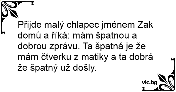 Přijde malý chlapec jménem Zак domů a říká: mám špatnou a dobrou zprávu. Ta špatná je že mám čtverku z matiky a ta dobrá že špatný už došly.
