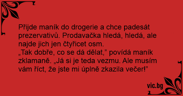 Přijde maník do drogerie a chce padesát prezervativů. Prodavačka hledá, hledá, ale najde jich jen čtyřicet osm.