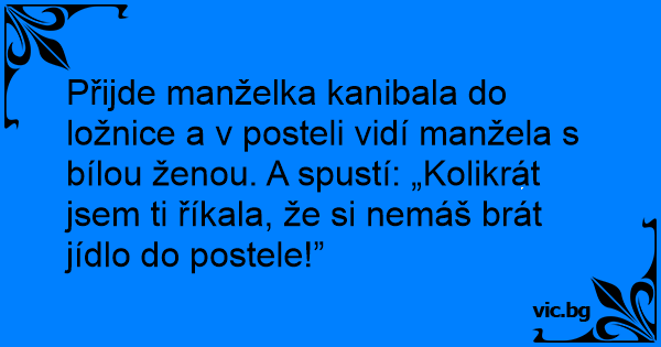 Přijde manželka kanibala do ložnice a v posteli vidí manžela s bílou ženou. A spustí: „Kolikrát jsem ti říkala, že si nemáš brát jídlo do postele!”
