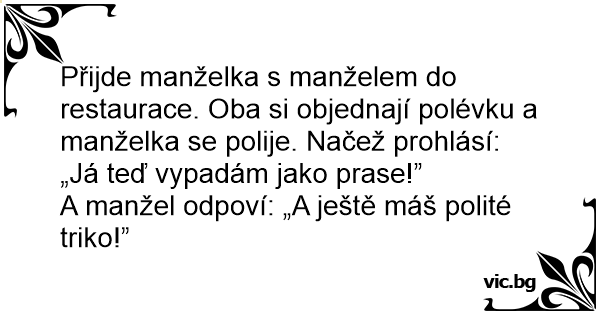 Přijde manželka s manželem do restaurace. Oba si objednají polévku a manželka se polije. Načež prohlásí: „Já teď vypadám jako prase!”