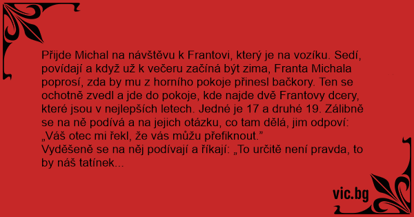 Přijde Michal na návštěvu k Frantovi, který je na vozíku. Sedí, povídají a když už k večeru začíná být zima, Franta Michala poprosí, zda by mu z horního pokoje přinesl bačkory. Ten se ochotně zvedl a jde do pokoje, kde najde dvě Frantovy dcery, které jsou v nejlepších letech. Jedné je 17 a druhé 19. Zálibně se na ně podívá a na jejich otázku, co tam dělá, jim odpoví: „Váš otec mi řekl, že vás můžu přefiknout.”