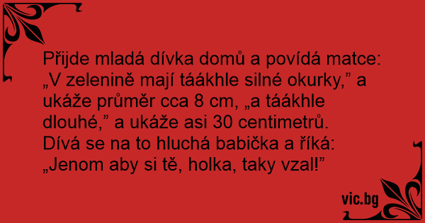 Přijde mladá dívka domů a povídá matce: „V zelenině mají táákhle silné okurky,” a ukáže průměr cca 8 cm, „a táákhle dlouhé,” a ukáže asi 30 centimetrů.