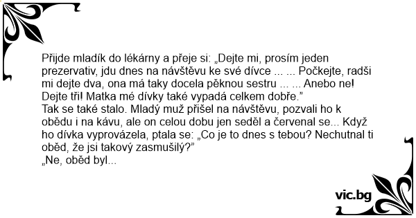 Přijde mladík do lékárny a přeje si: „Dejte mi, prosím jeden prezervativ, jdu dnes na návštěvu ke své dívce ... ... Počkejte, radši mi dejte dva, ona má taky docela pěknou sestru ... ... Anebo ne! Dejte tři! Matka mé dívky také vypadá celkem dobře.”