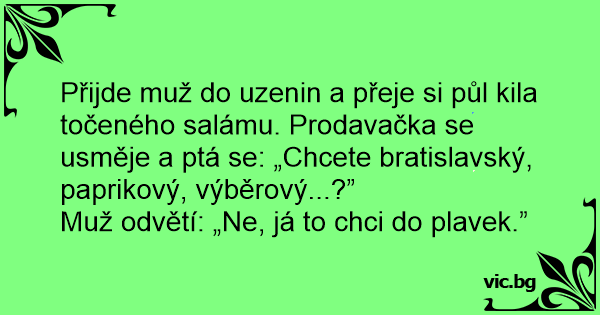 Přijde muž do uzenin a přeje si půl kila točeného salámu. Prodavačka se usměje a ptá se: „Chcete bratislavský, paprikový, výběrový...?”