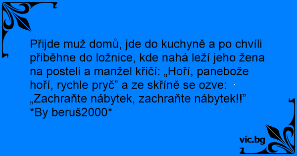 Přijde muž domů, jde do kuchyně a po chvíli přiběhne do ložnice, kde nahá leží jeho žena na posteli a manžel křičí: „Hoří, panebože hoří, rychle pryč” a ze skříně se ozve: „Zachraňte nábytek, zachraňte nábytek!!”