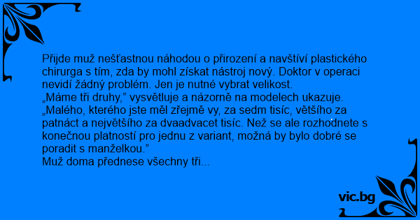 Přijde muž nešťastnou náhodou o přirození a navštíví plastického chirurga s tím, zda by mohl získat nástroj nový. Doktor v operaci nevidí žádný problém. Jen je nutné vybrat velikost.