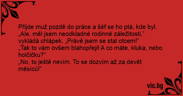 „Ale, měl jsem neodkladné rodinné záležitosti,” vykládá chlápek. „Právě jsem se stal otcem!”