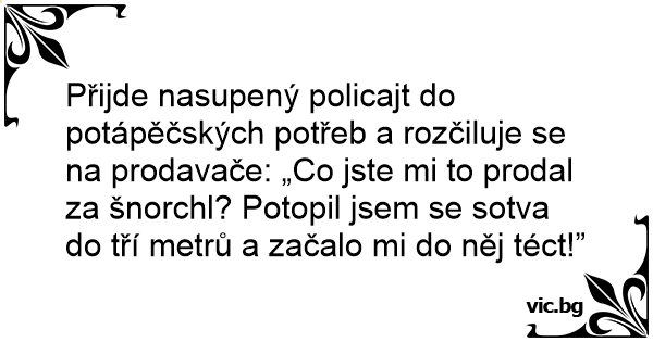 Přijde nasupený policajt do potápěčských potřeb a rozčiluje se na prodavače: „Co jste mi to prodal za šnorchl? Potopil jsem se sotva do tří metrů a začalo mi do něj téct!”