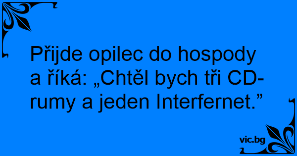 Přijde opilec do hospody a říká: „Chtěl bych tři CD-rumy a jeden Interfernet.”