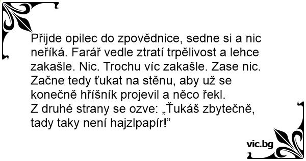 Přijde opilec do zpovědnice, sedne si a nic neříká. Farář vedle ztratí trpělivost a lehce zakašle. Nic. Trochu víc zakašle. Zase nic. Začne tedy ťukat na stěnu, aby už se konečně hříšník projevil a něco řekl.