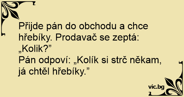 Přijde pán do obchodu a chce hřebíky. Prodavač se zeptá: „Kolik?”