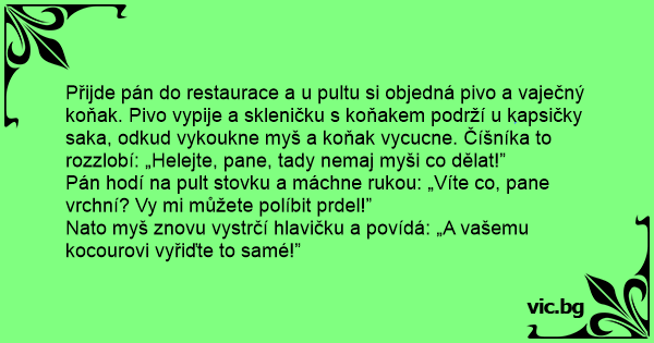 Přijde pán do restaurace a u pultu si objedná pivo a vaječný koňak. Pivo vypije a skleničku s koňakem podrží u kapsičky saka, odkud vykoukne myš a koňak vycucne. Číšníka to rozzlobí: „Helejte, pane, tady nemaj myši co dělat!”