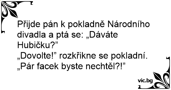 Přijde pán k pokladně Národního divadla a ptá se: „Dáváte Hubičku?”
