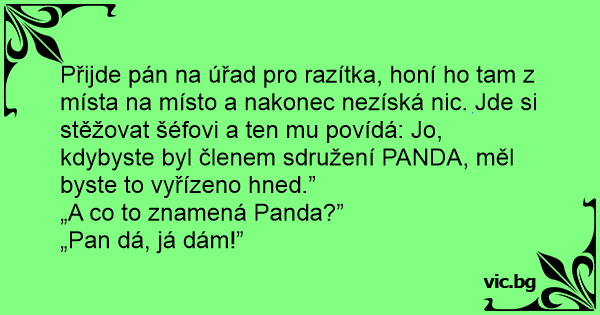 Přijde pán na úřad pro razítka, honí hо tam z místa na místo a nakonec nezíská nic. Jde si stěžovat šéfovi a ten mu povídá: Jo, kdybyste byl členem sdružení PANDA, měl byste to vyřízeno hned.”