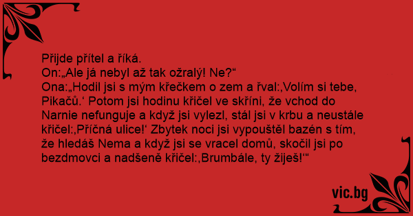 Ona:„Hodil jsi s mým křečkem o zem a řval:‚Volím si tebe, Pikačů.‘ Potom jsi hodinu křičel ve skříni, že vchod do Narnie nefunguje a když jsi vylezl, stál jsi v krbu a neustále křičel:‚Příčná ulice!‘ Zbytek noci jsi vypouštěl bazén s tím, že hledáš Nema a když jsi se vracel domů, skočil jsi po bezdmovci a nadšeně křičel:,Brumbále, ty žiješ!‘“