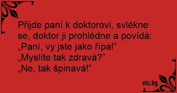 Přijde paní k doktorovi, svlékne se, doktor ji prohlédne a povídá: „Paní, vy jste jako řípa!”