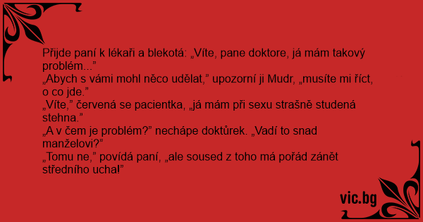 „Víte,” červená se pacientka, „já mám při sexu strašně studená stehna.”