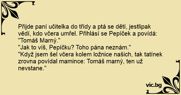 Přijde paní učitelka do třídy a ptá se dětí, jestlipak vědí, kdo včera umřel. Přihlásí se Pepíček a povídá:
