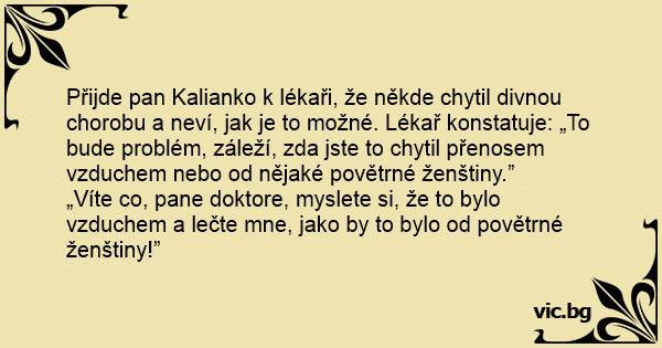 Přijde pan Kalianko k lékaři, že někde chytil divnou chorobu a neví, jak je to možné. Lékař konstatuje: „To bude problém, záleží, zda jste to chytil přenosem vzduchem nebo od nějaké povětrné ženštiny.”